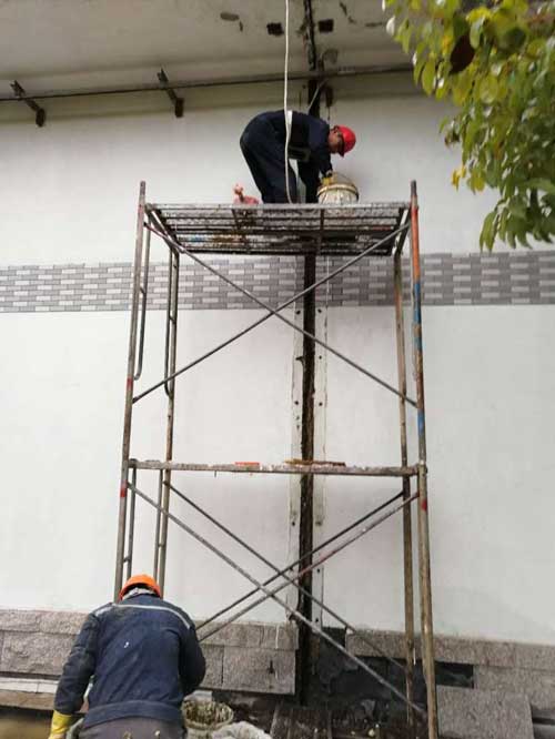 ① 清理:详细检查、分析渗漏情况,凿除混凝土沉降缝中填充的木头及表面突起及析出物,确定灌浆孔位置及间距。清理干净需要施工的区域,确保表面干净湿润。
